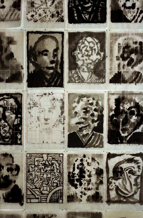 Monk Head drawings, ink on grid rice paper, 78 x 201 inches, Robischon Gallery, 2001