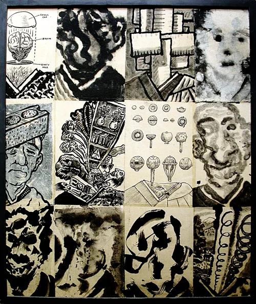 Sumi ink on rice paper, outlined images overlaid. Some with the usual monk head or hydra-head motif as part of the overlaid imagery. The larger are 30 x 40 inches, and various smaller sizes. 1991 - 2017