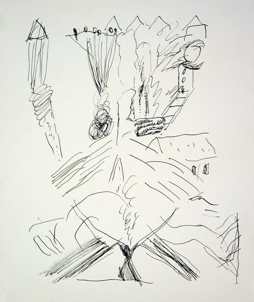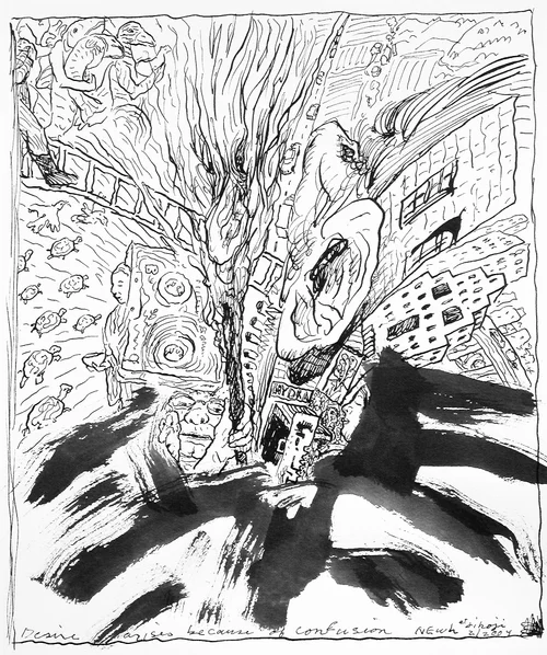 A set of small (10 x 7 inches) drawings, simple pen and ink on paper, all involving a potential bust/head/face motif, often evolving or devolving into something other than a head. Some have multiple faces or reference of identity. Many have the monk robe in the bust, have narrative implication, or work with shape and line independent of such. Series has 140 drawings in the set as of early 2018.