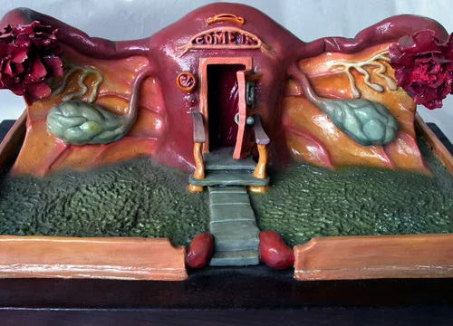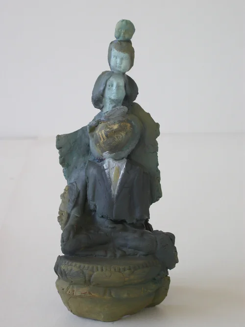 Small ceramic relief and Table sculptures, most polychromed in oil, some with mixed media added, some with a glaze or raku surface. Many carry the same face/head/hydra motif of the paintings and drawings.